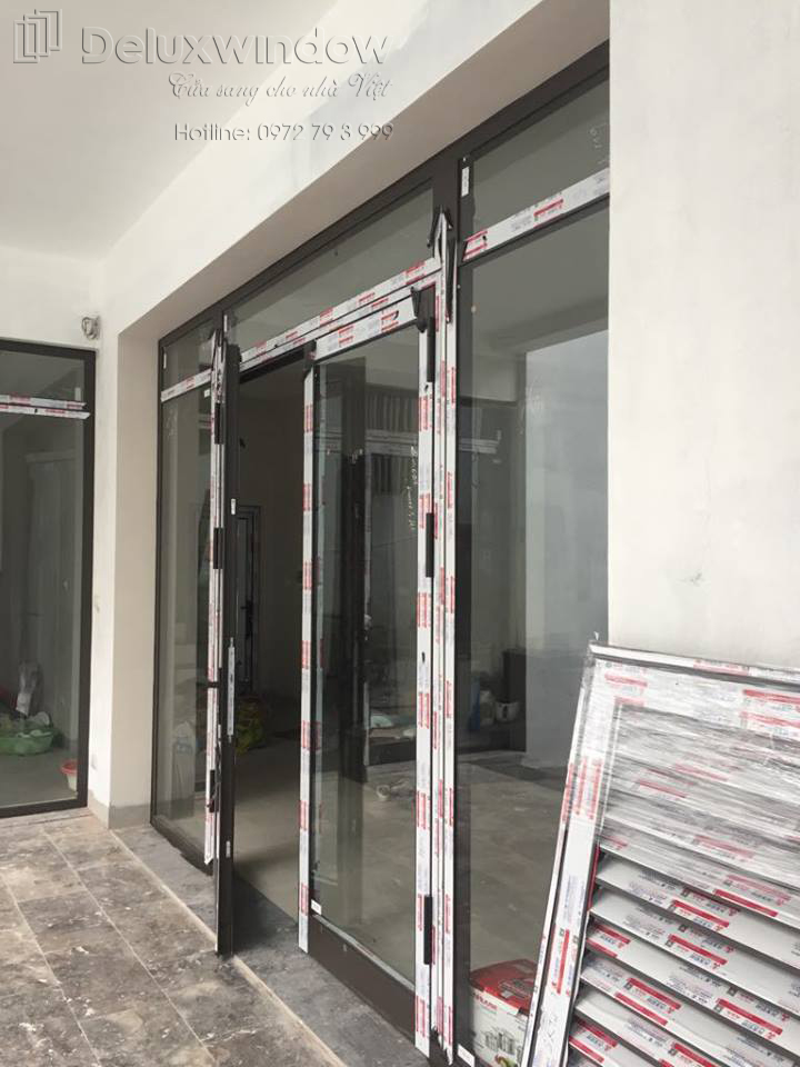- Cửa đi mở quay 2 cánh lắp tại vị trí cửa mặt trước tầng 1, cửa ra ngoài ban công, nếu cửa cao và rộng kết hợp thêm vách cố định hai bên và trên.